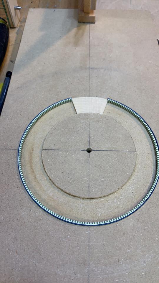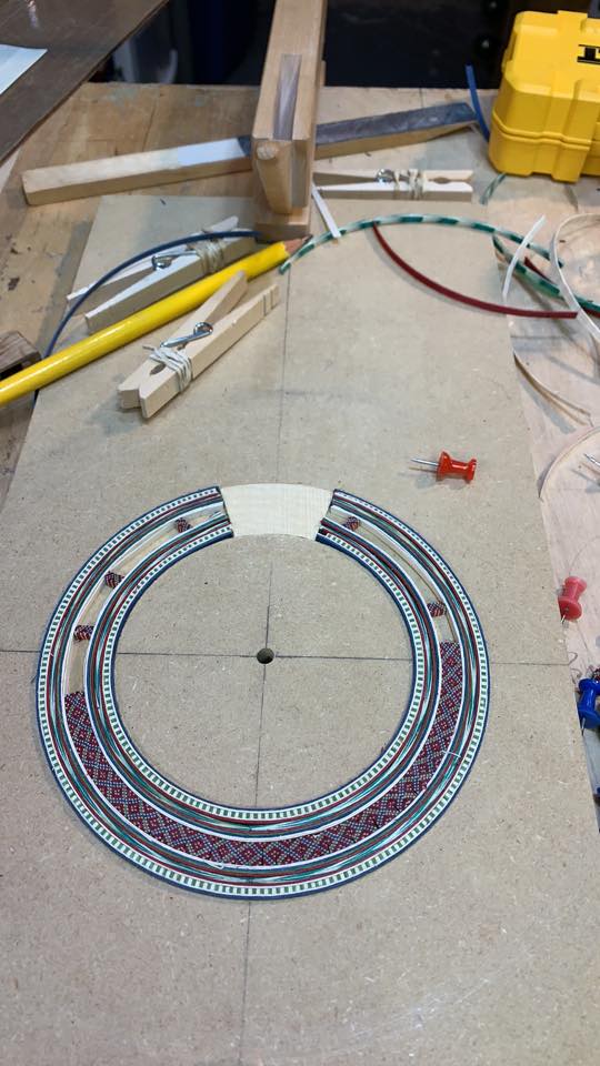 The rosette is one of the areas of the guitar in which luthiers can express their artistic creativity, making each guitar unique. The function of the rosette is more than just decorative, it strengthens the area of the sound hole to prevent possible cracks and other problems. Working the marquetry for the rosette, back strip, endblock strip and purfling is strteamely rewarding, though it is slow and detail work.